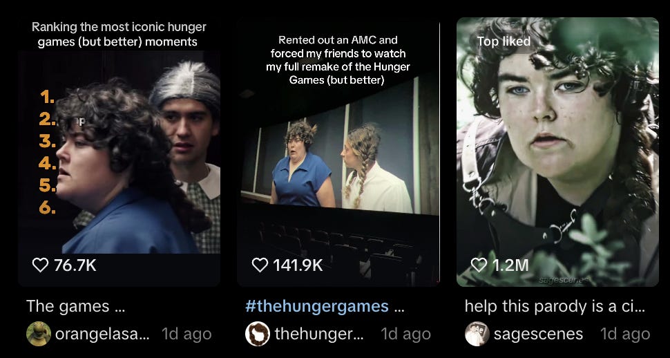 Reiter and her crew clearly know how online storytelling in the parody space works, from pacing to fan-service to self-aware subversions (note that the BTS is almost as long as the movie itself). It’s the same reason Lower Decks is the best Star Trek: it genuinely loves the thing it’s riffing on. And given that Hunger Games prequel Sunrise on the Reaping trailers are starting to make the rounds, the timing is perfect.